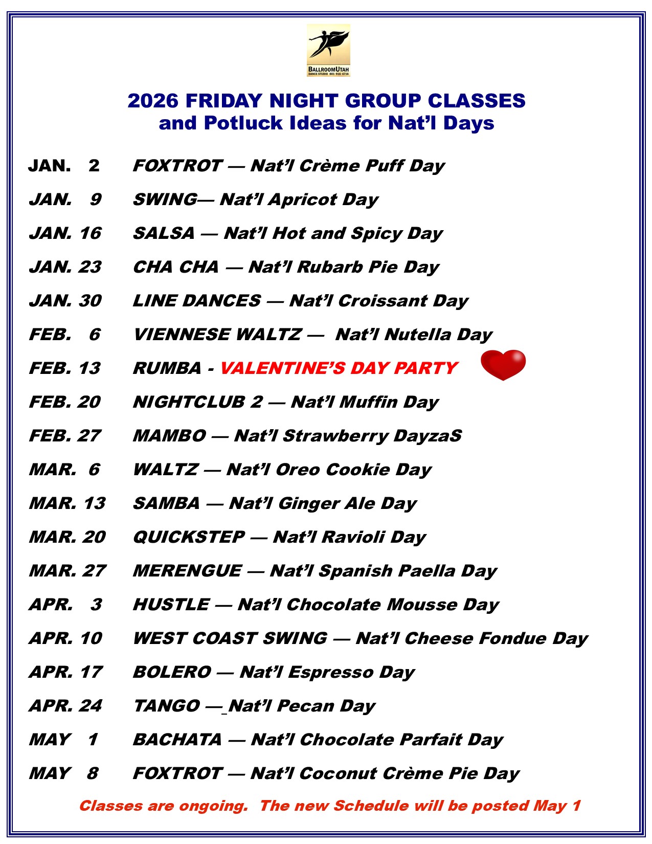 A romantic Rumba class will be taught 7:15 - 8:00 pm followed by a dance party and yummy food from 8:00 - 10:00 pm.