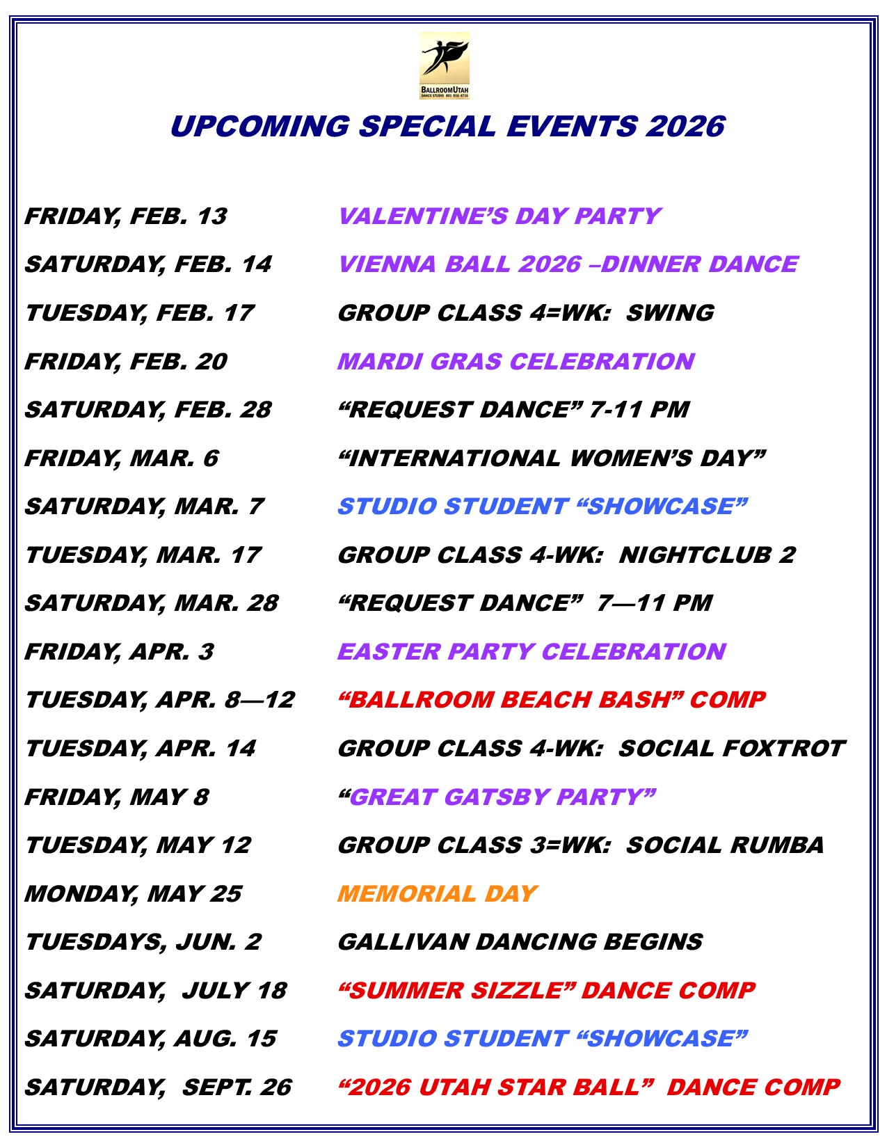 We are Salt Lake City’s Best Ballroom & Latin Dance School. We teach International & American Ballroom & Latin Styles of Dance. We are the only facility with a spring-floating dance floor (easy on your knees).